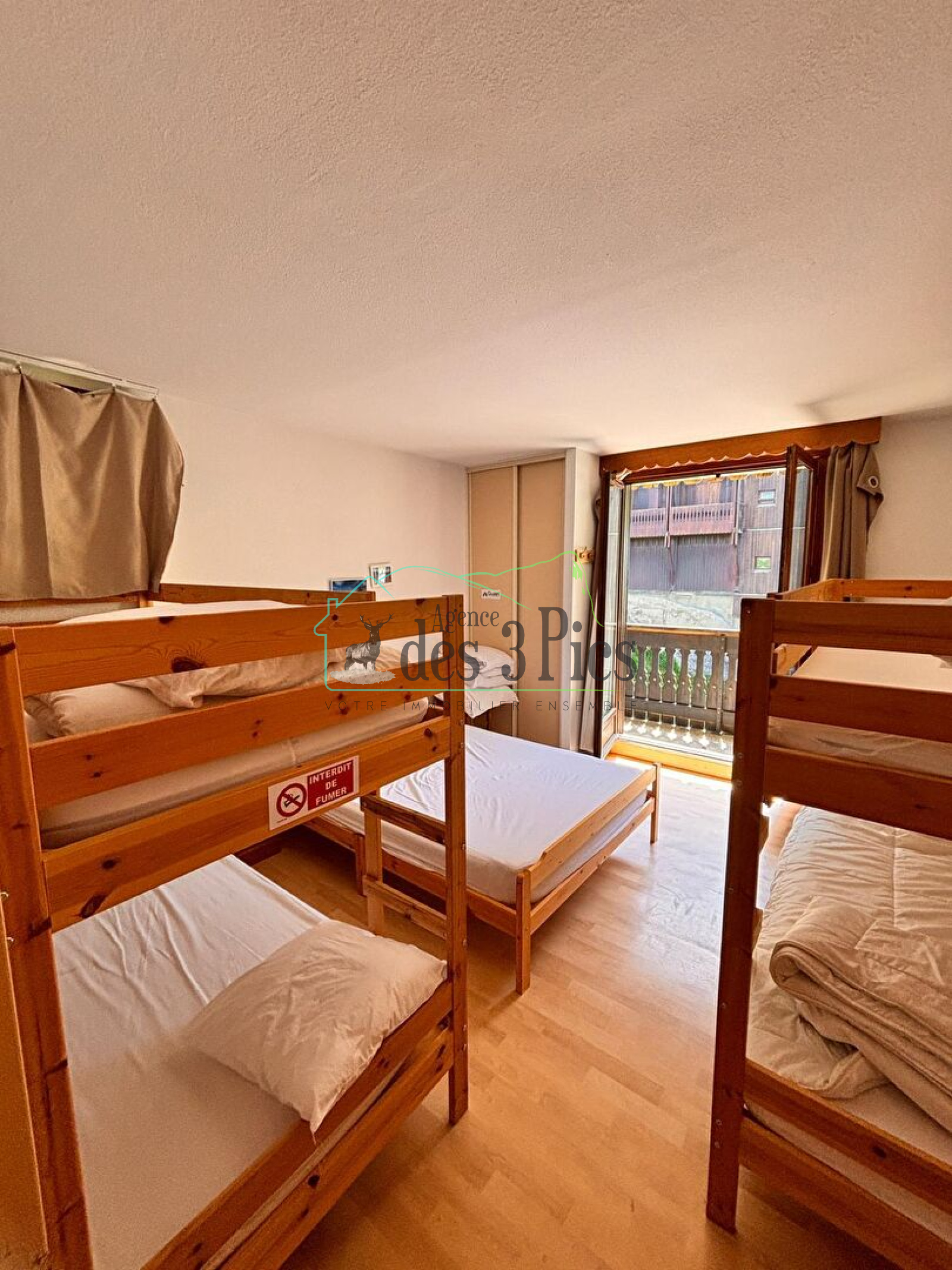 Grande pièce à vivre avec cuisine américaine de 21m2 donnant sur une terrasse avec vue directe sur les pistes et grande chambre dortoir. L'appartement se vend meublé et équipé.