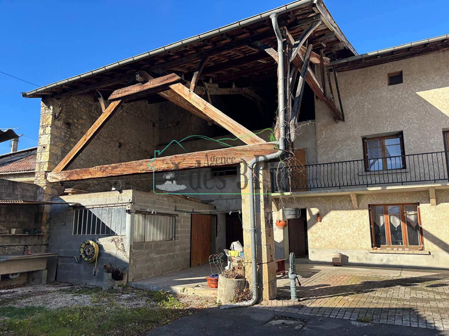 La maison possède deux entrées, une par la rue principale et une par la cour du côté de place, le tout clos avec un portail. Les combles sont aménageables (70 et 86m2). Dans la cour, un abri/garage pour voiture avec une fosse pour faire les vidanges, un atelier, un garage, une terrasse couverte, une terrasse non couverte. On y trouve également un lavoir, un barbecue et un four à pain à bois. Le tout sans vis à vis, avec une vue sur les Pyrénées.